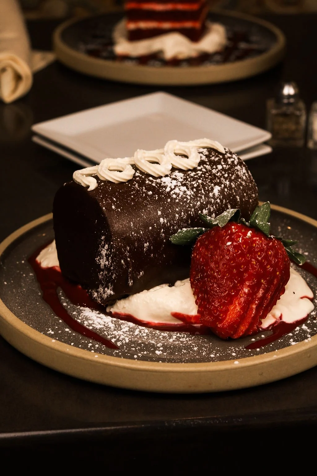 homemade HoHo. raspberry sauce. whipped cream. strawberries.